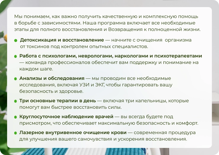 Постоянное наблюдение обеспечивает безопасность пациента, своевременную корректировку лечения, предотвращение срывов. Благодаря этому восстановление проходит без опасных осложнений.